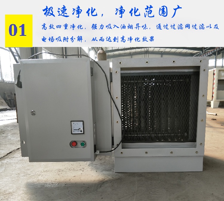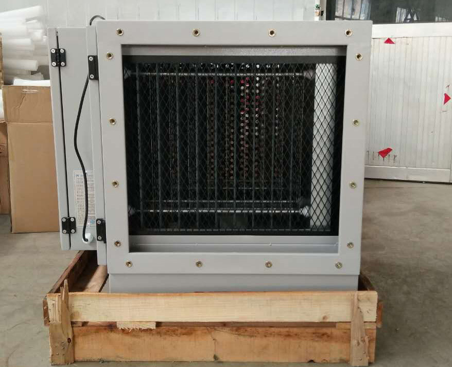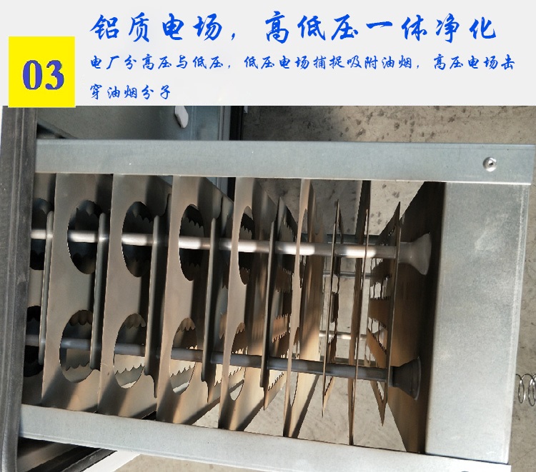 大顆粒油滴通過前擋板在自身重力作用下流入油槽排出。剩余的小粒徑污染物進入離子高壓靜電區,通過